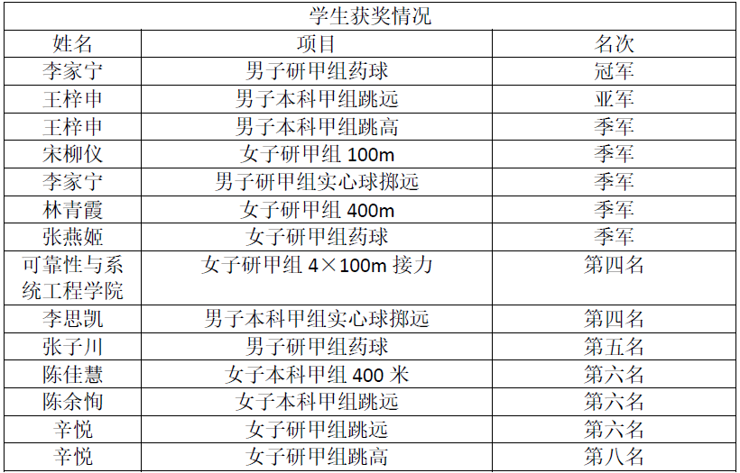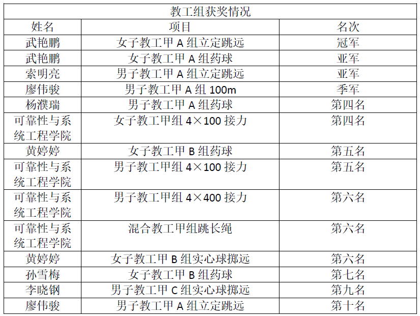 在全体参赛师生的共同努力下,36365线路检测中心no1在本次运动会中斩获佳绩!其中,冠军2名,亚军3名,季军5名,多个项目获得前十名。学院参赛老师们获得教工甲组团体总分第五名,学院获得道德风尚奖,硕果累累!